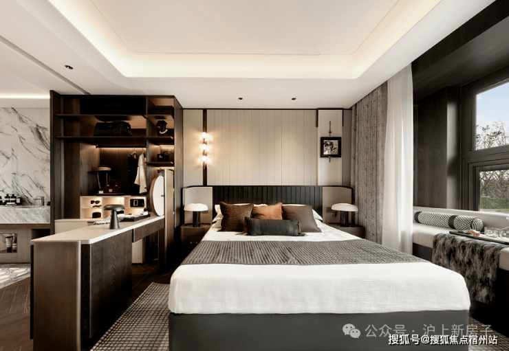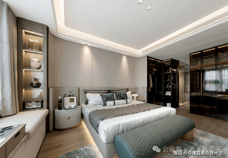 南北通透的主卧套房,则是另一种“极致”,将主卧小家化的功能性得到了充分释放,但同时酒店式的设计则为私密空间的舒适度与空间仪式感给予了最佳的氛围;更阔绰的飘窗设计,不仅让室内空间更拓展,视野更开阔,还能承载更多功能,坐在飘窗上品茗、读书,享受午后阳光的轻抚,听耳边小鸟的低鸣,生活就是这样惬意。