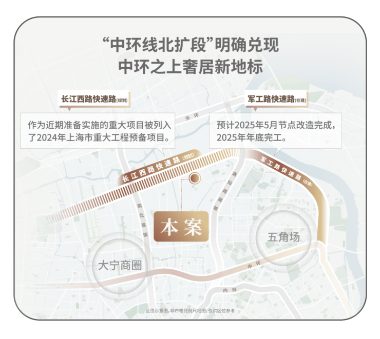 作为上海城市更新的重大规划,“中环北抬”通过延伸中环线北部三条快速路——军工路、长江西路、沪太路相互连接,形成一条全新的交通动脉,组建成为新的“中环”。招商序售楼处电话:400-833-6309【预约☎】其中,逸仙路高架直通中环和内环高架;在建的军工路快速路新建工程,将在今年内完工,通车后将为宝山吴淞、淞南前往杨浦、浦东增加一条出行选择,有效缓解逸仙路高架交通压力。