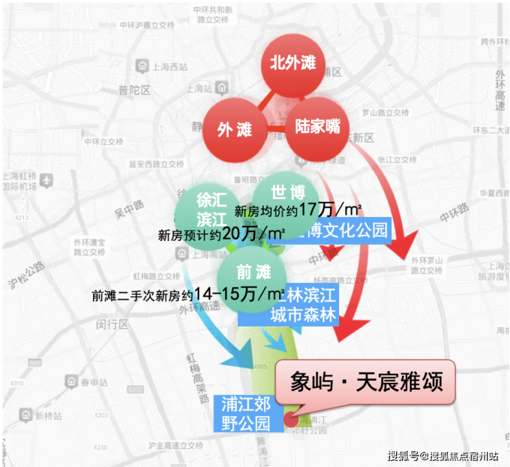 从上图可见,这两个滨江黄金三角的商业、产业、生态资源就在闵行浦江的正上方。但其房价早已是高攀不起,世博17万/㎡、徐滨冲20万/㎡,前滩二手房价已达14-15万/㎡(数据来源:链家网)!对比之下,仅6站地铁距离的浦江板块,显然性价比更高,未来潜力巨大。而且象屿·天宸雅颂占据黄浦江中上游生态链的黄金中轴,前景可期!