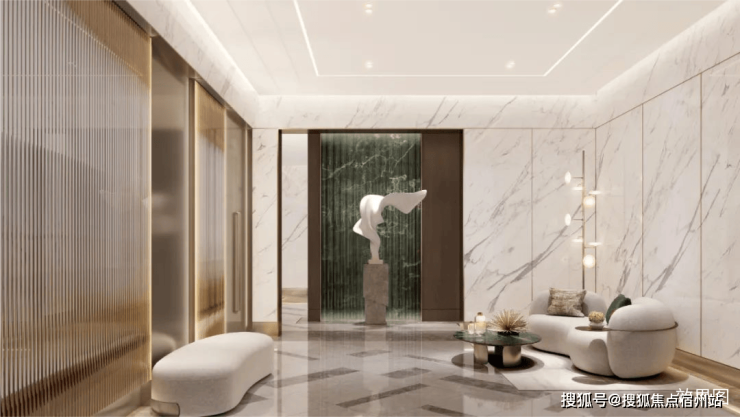 现代简奢首层大堂,甄选“宝格丽绿”奢石背景墙,尽显高贵气质。将弧形元素、线条融入电梯轿厢,丰富视觉艺术感,迎纳每一位塔尖人物的荣归。