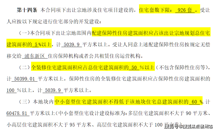 根据出让合同显示,项目占地面积约55988.9m²,容积率为1.8,限高50米, 住宅套数下限926套,需配建5%以上的保障性住房,全装修比例50%。