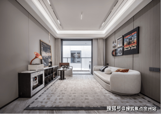 客厅约3.4m面宽,地面都是一体通铺的90*180大面砖,简洁清爽。