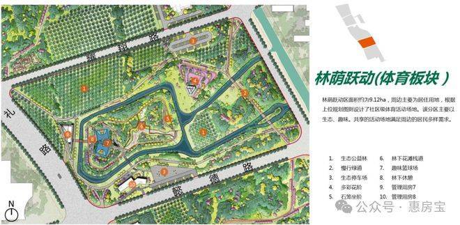 整座公园(在建中)划分为:湿地花园区、鸣湖共享区、林荫跃动区和社邻园艺区,四大功能分区。