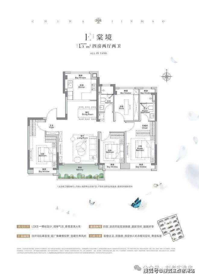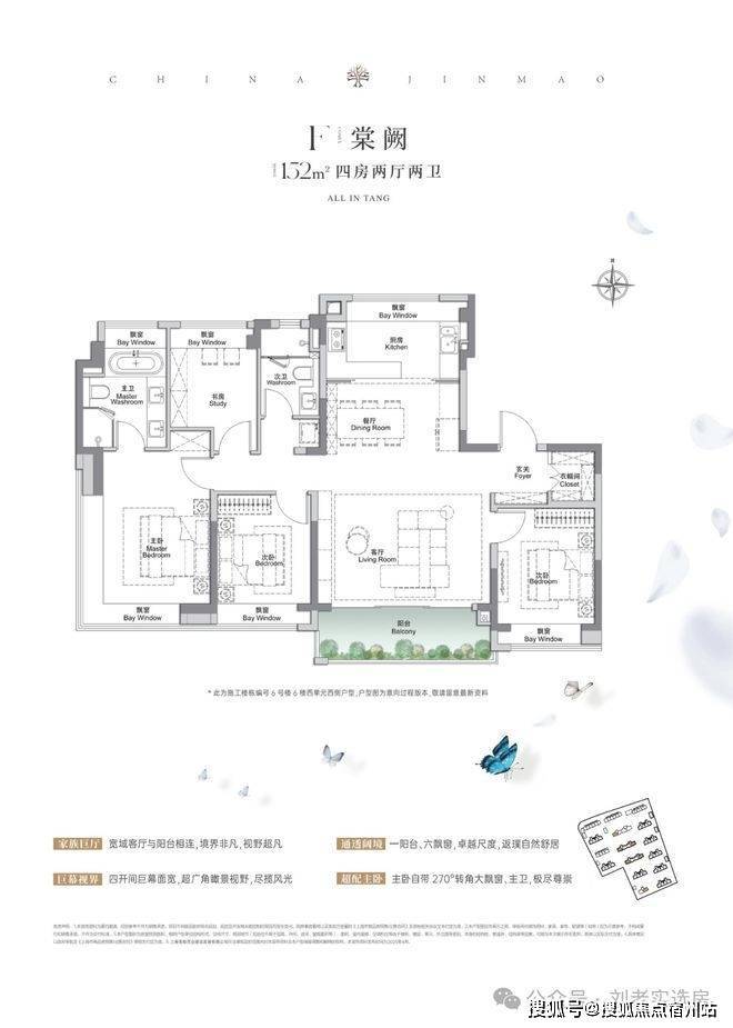 建面约105、117㎡3房2厅2卫,空间布局非常相似,✅✅金茂棠前售楼处电话:400 - 8824 - 258✅✅都做到了三开间朝南+多个飘窗+主卧套房设计+270°转角飘窗