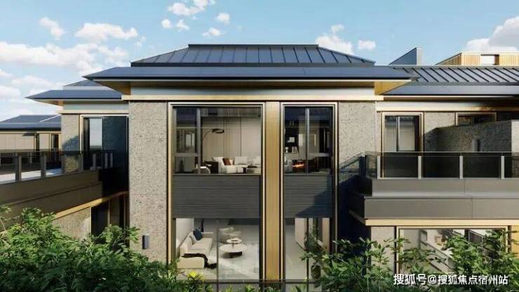 项目采以经典三段式别墅立面,中灰色石材为基座,奢石宁静与土地矜贵互为映衬。中灰色石材的厚重感,深灰色铝板的舒展度,“安缦金”高奢质感勾勒边框,与蓝眼睛光面石砖、冰花蓝光面石材的交织下,呈现出“天光云影、浮光跃金”的意境。
