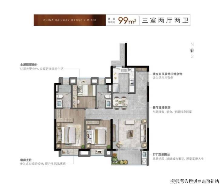 约99㎡的三室两厅两卫,三开间朝南,5飘窗设计,无空间浪费,极致细节和户型的考虑打磨。得房率约79%,套内面积达78㎡。