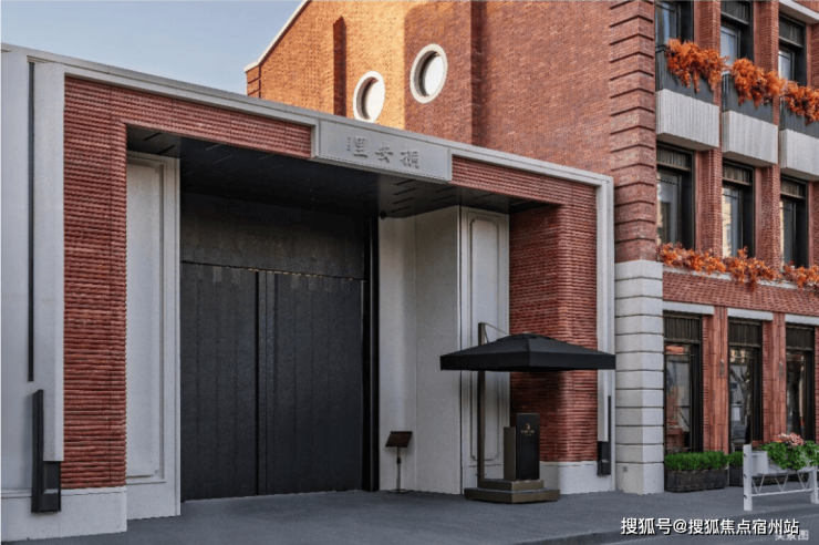 立面采用 传统手工青红砖,以垂花席纹拼贴;大门选用 风貌复古红洞石,辅以 手工捶打的铜饰;