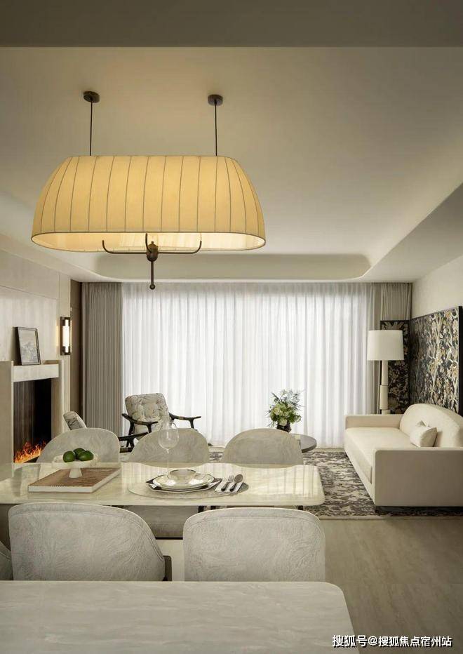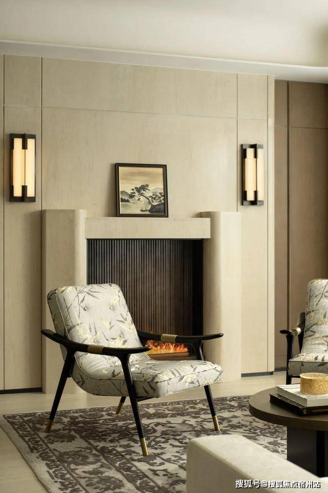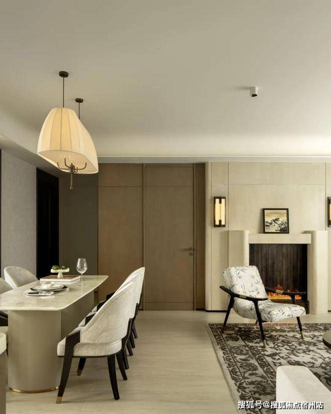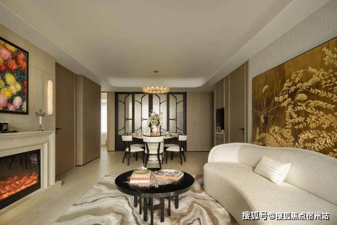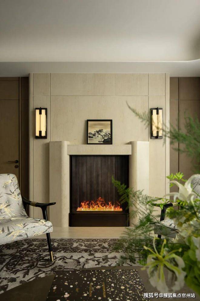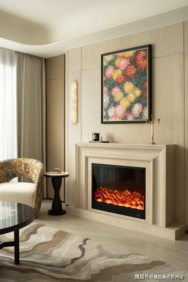 开放式客厅延续法式温润格调,中央设置天然石材壁炉,温厚质感与手工雕刻相得益彰。米灰交错的肌理如银杏叶落,火光流转其间,赋予空间岁月沉淀般的宁静与雅致。