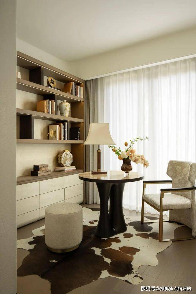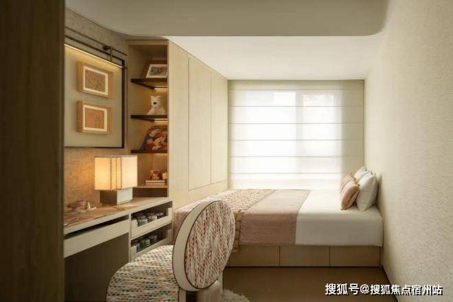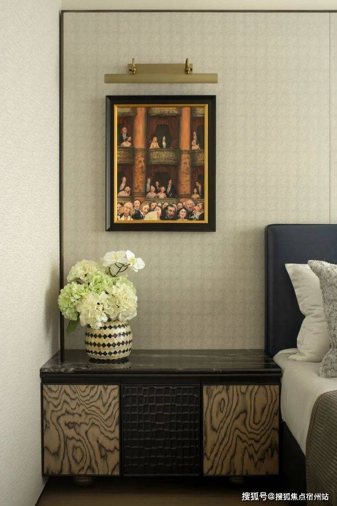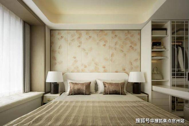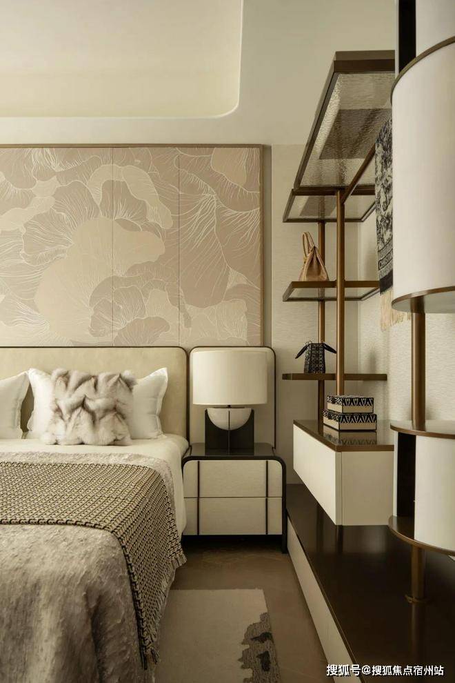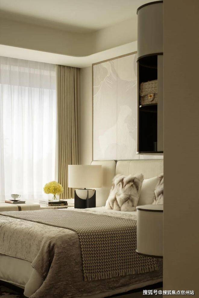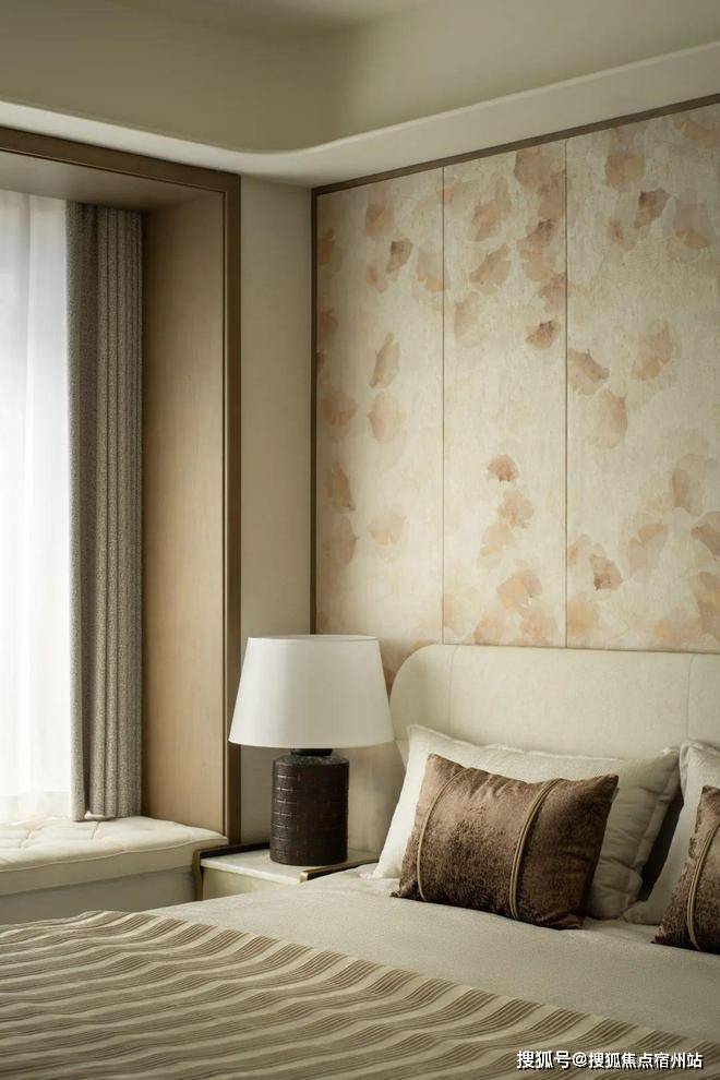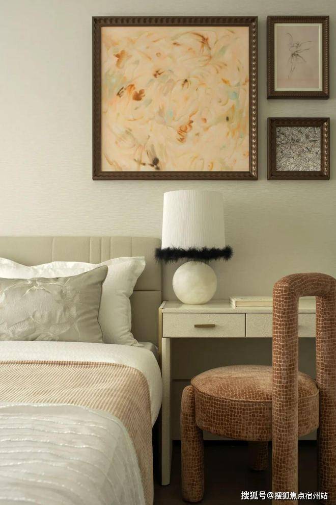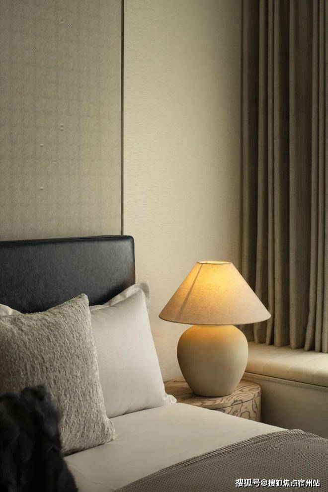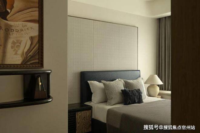 卧室延续现代轻奢美学,以浅米、象牙白与烟灰为主调,边柜、灯具与挂画比例得当,简净线条与细腻材质在自然光下交叠,形成克制而丰富的层次感。