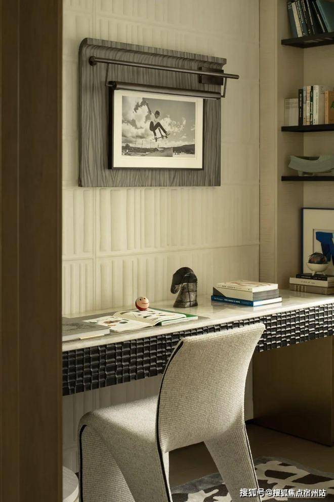 开放式餐厅位于玄关与客厅主轴之上,流畅串联厨房与咖啡吧区。丝光布艺吊灯如温光垂落,托起日常三餐的情感氛围。咖啡吧采用锈镜银杏纹饰面,为空间注入自然脉络与金属光感,于此慢煮时光,细品生活本味,沉淀片刻身心的松弛。