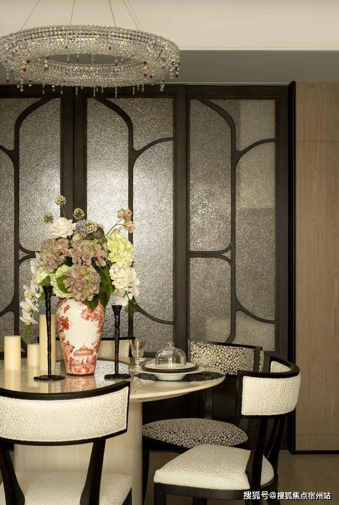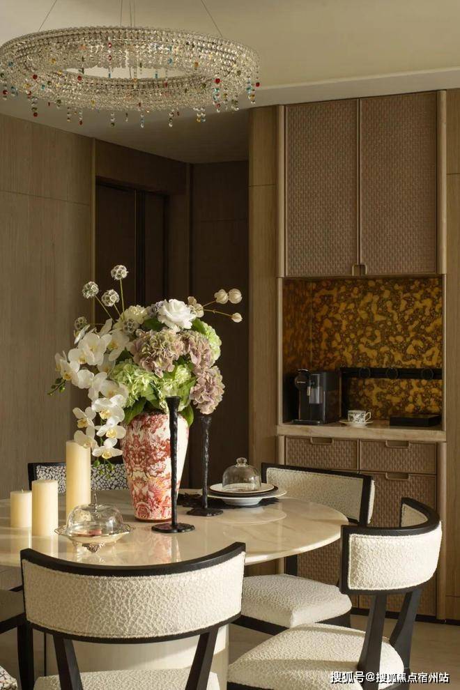 日常的仪式感,蕴藏于光影与花事之中。餐厅黑白配色克制优雅,椅面布艺肌理细腻,顶部悬挂的水晶灯饰,于餐叙间折射出丰盛而细腻的生活光感。