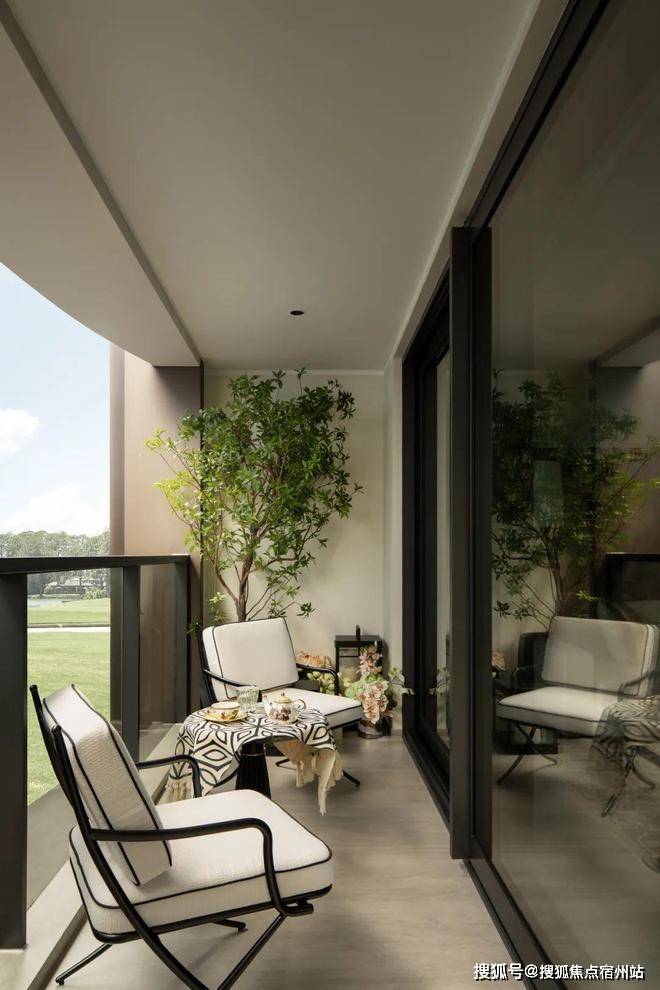 花园阳台以绿植围合自然界面,搭配织物小几与藤编靠椅,营造一方可闲适栖居的室外起居角,坐观光影流转,沉淀悠然时光。