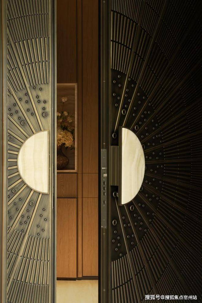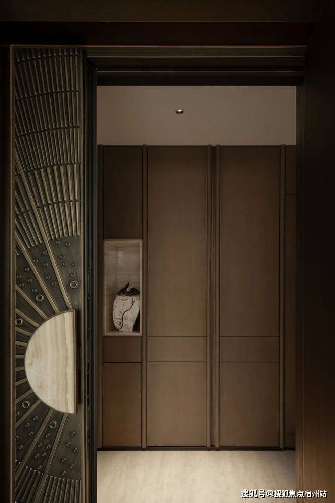 电梯厅端景墙悬挂金漆手绘艺术品,画面取意奔马腾跃,于绢金底色中彰显精神张力。流动线条与金属光泽交织,构筑归家瞬间的艺术焦点与仪式格调。