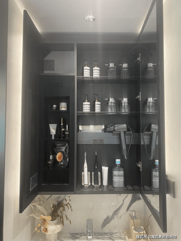 尤其是卫生间的镜柜,使用了内外双镜,并且内部的收纳空间相当丰富,小到女主人的发箍、面膜、口红、香水,大到吹风机都有适合的位置。