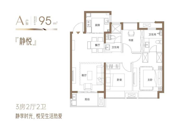 『静悦』约95㎡3房2厅2卫:三开间向阳户型,面朝风景,沐浴阳光;全明通透,让阳光照进每一寸惬意生活;户户飘窗,逐光而居,延伸空间尺度;全明卫设计,赋予私密空间明亮与清新;。方正有序的空间艺术,舒适实用,张弛有度
