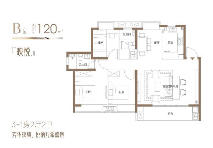 『映悦』约120㎡3+1房2厅2卫:3+1灵动空间为成长型家庭定制,容纳万象;奢阔横厅,阳光与美景,映见人生宽境;客厅与开放式书房相融,开启生活格调;IMAX巨幕观景阳台,邂逅流动的四季诗意;四面宽向阳·全明格局·全系飘窗,向美而居。