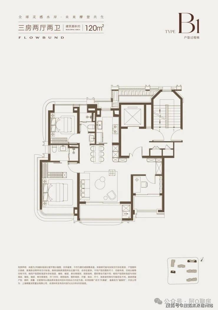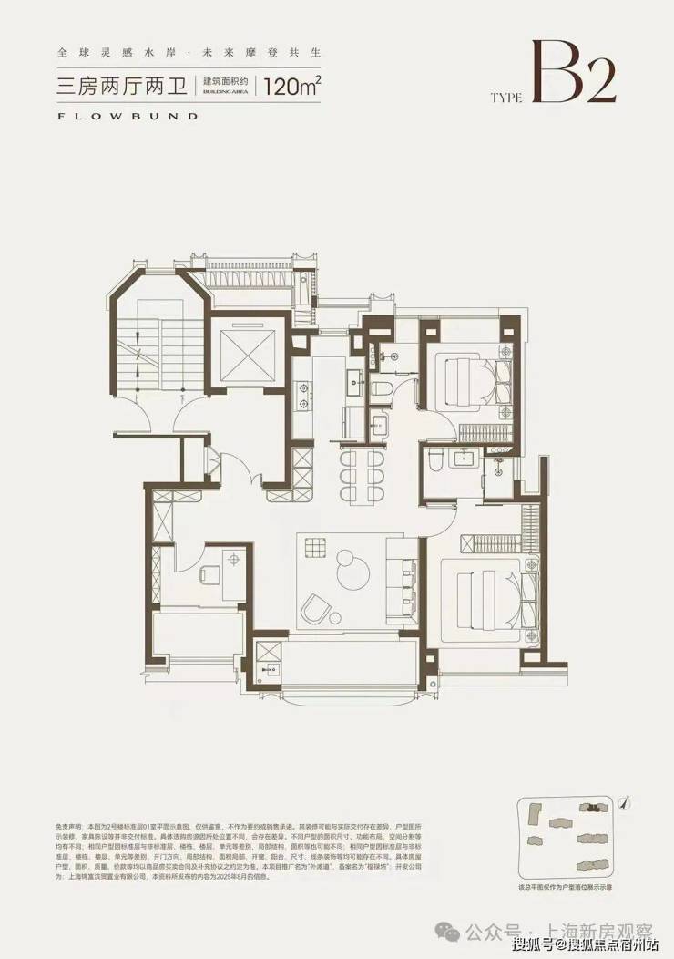 建面约120㎡的大横厅、双阳台产品,并没有勉强去做4房,而是打造了一个超宽绰的3房产品。