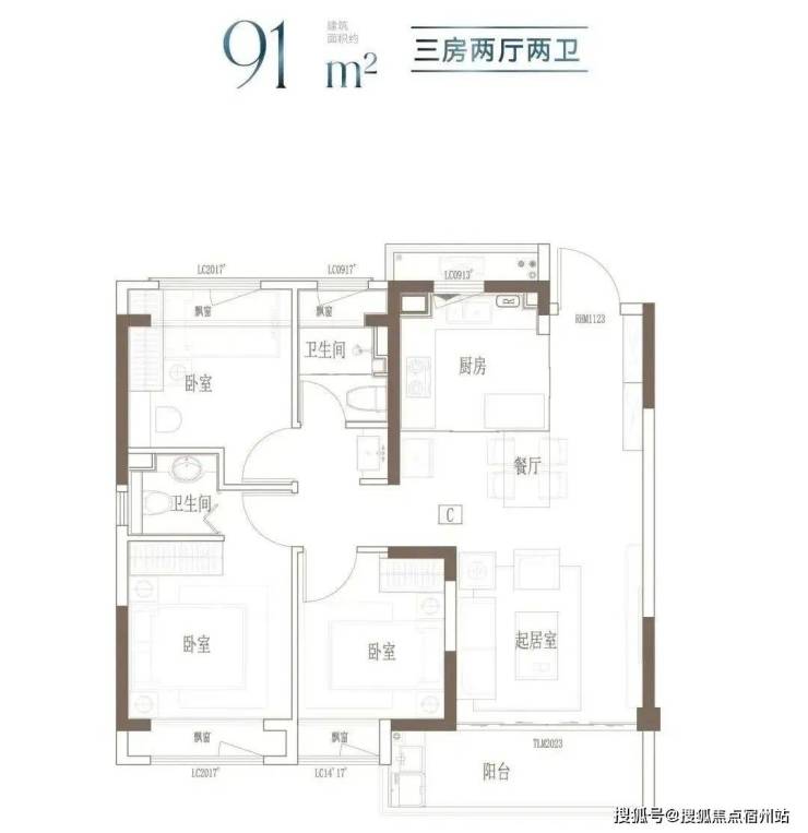 建面约91㎡ 3房2厅2卫▼