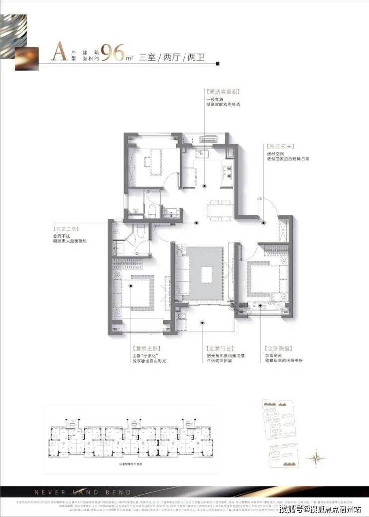 项目建面约100㎡3房2卫仍然是优秀的飞机户型,但实现该面积段少见的 大面宽横厅设计!