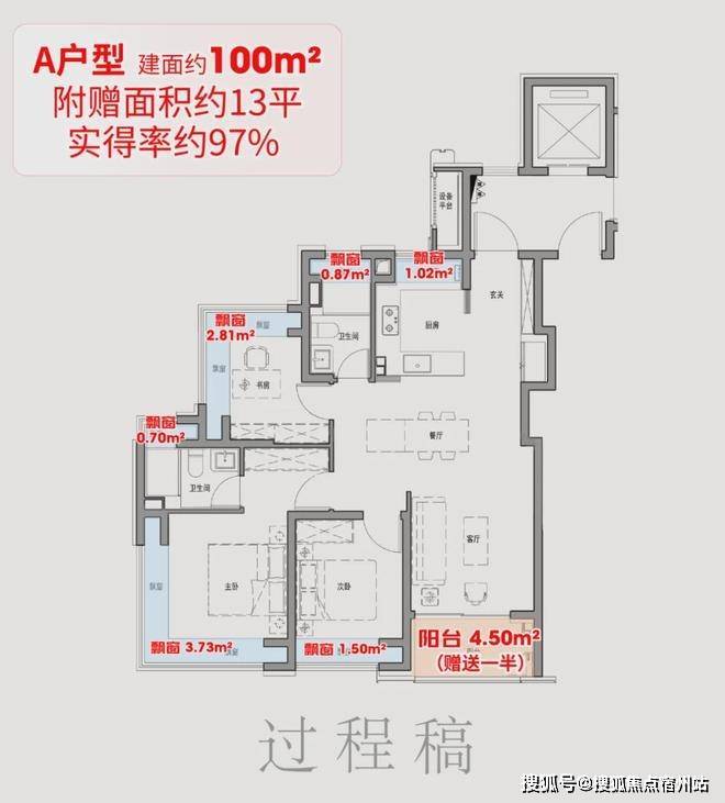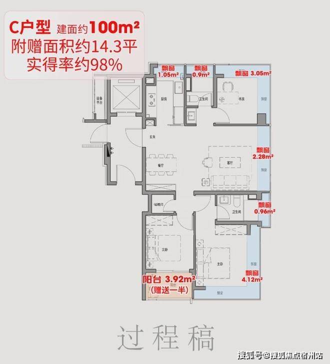 · 常规百平米户型仅3-4个飘窗,总赠送约6-7平;