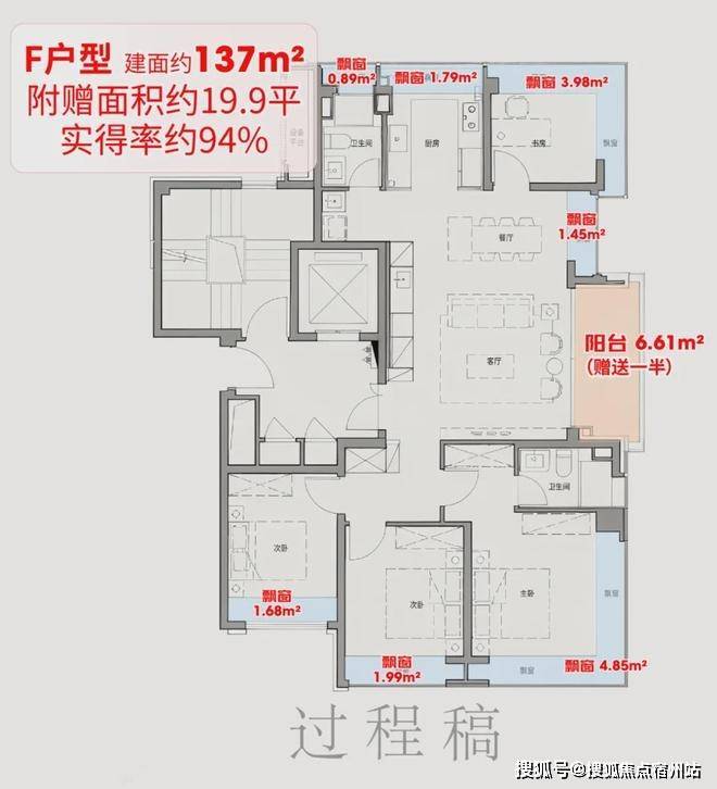 F户型7飘窗,总赠送面积约19.9平,实得率约94%;