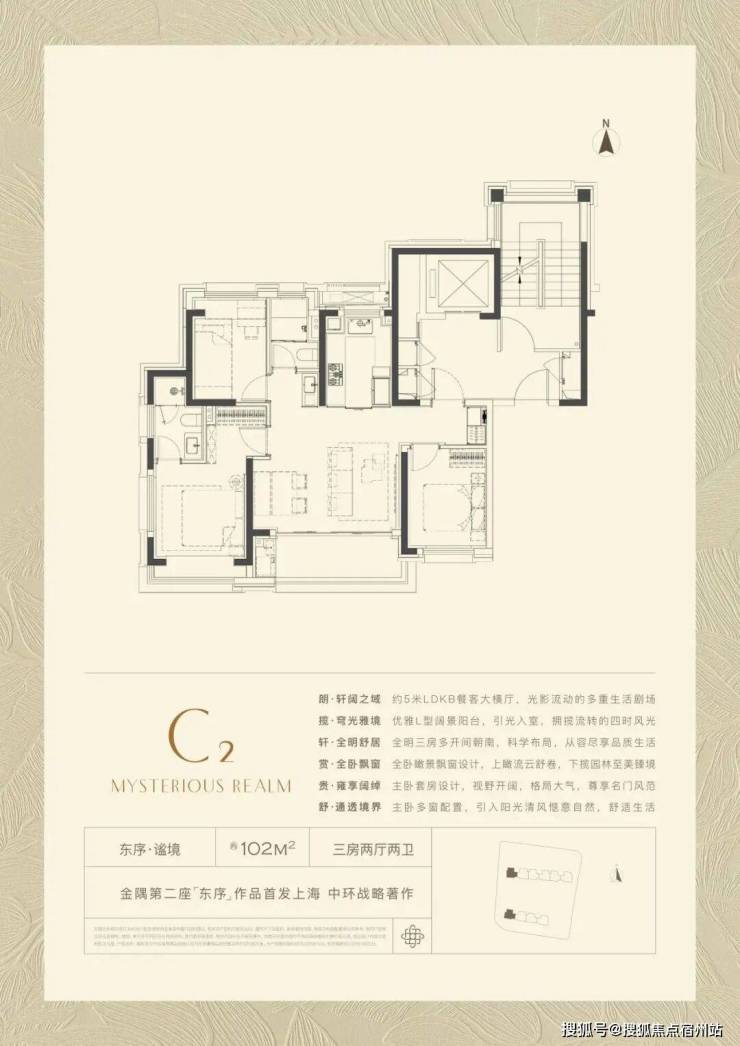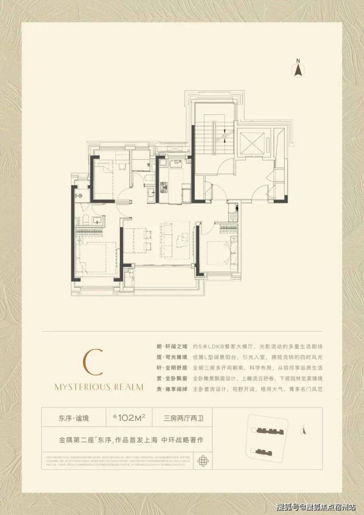 102㎡产品的全新产品,格局上超越了传统意义的三开间朝南, 超大尺度的5米横厅 , 真正实现3.5开间 ,让业主起居之间沐浴更多阳光的同时,公区尺度感也直逼其他项目建面约100-120㎡户型。