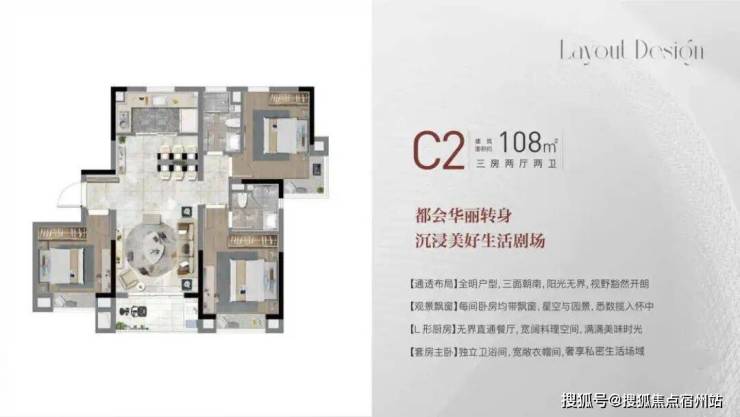 建面约108㎡3房2厅2卫,做到了三开间朝南+双阳台设计+主卧套房设计+南北通透,该户型得房率非常高。