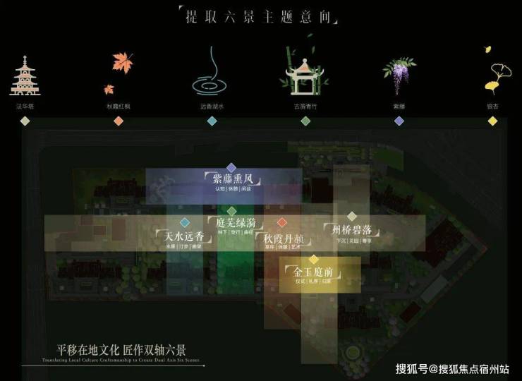 建筑们围合出的中心花园中,州桥老街、秋霞圃、远香湖、古猗园、紫藤园、银杏古树等嘉定6景被南山地产提炼、转译,形成了具有在地文化特色的6大景观主题空间。