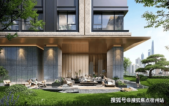 建筑融合新中式与现代简约风格,外立面采用葡萄牙米黄石材、古铜金属线条与超白玻璃幕墙,坡屋顶呼应老城厢天际线,兼具历史质感与现代奢感。