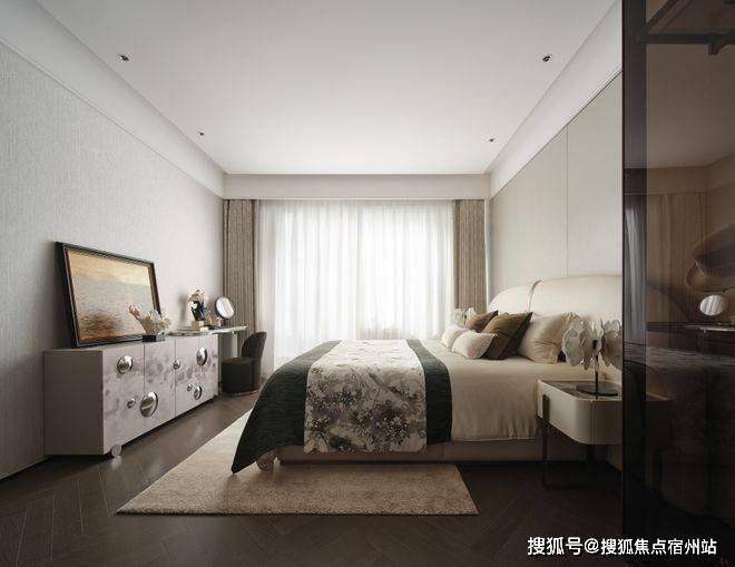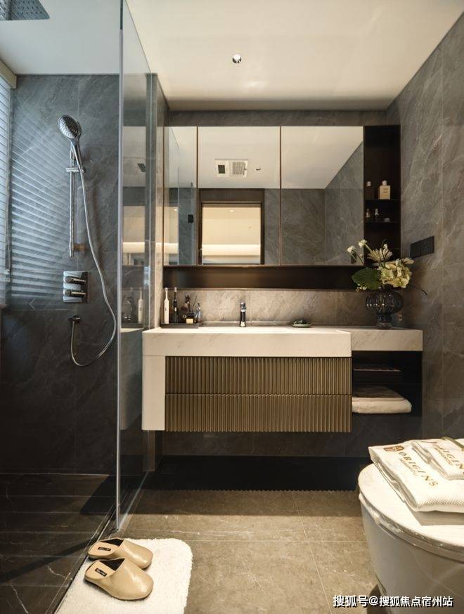 再来看主卧,主卧的面积达到将近20平米,尺度非常充裕。主卫也用了大量的岩板,配备德国唯宝卫浴系统,✅✅虹口源717售楼处电话:400 - 8824 - 258✅✅预留美妆冰箱改造空间的设计,细腻考量。