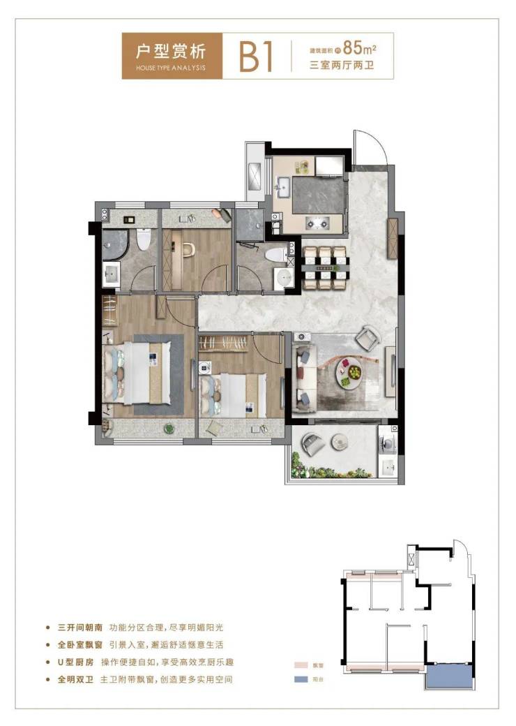 约85平三房户型,更是做到了三开间朝南,全卧室飘窗,拥有超大赠送面积,全明双卫,甚至主卫也附带飘窗,实用性拉满,而且该户型大部分房源总价在230万左右!