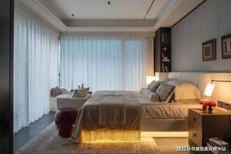 以整块奢岩破题,以皮革融入,白金沙岩板、140户型采用罗马白洞石岩板,主卧背景采用了车线工艺硬包,将豪宅标配升华为材质的史诗。