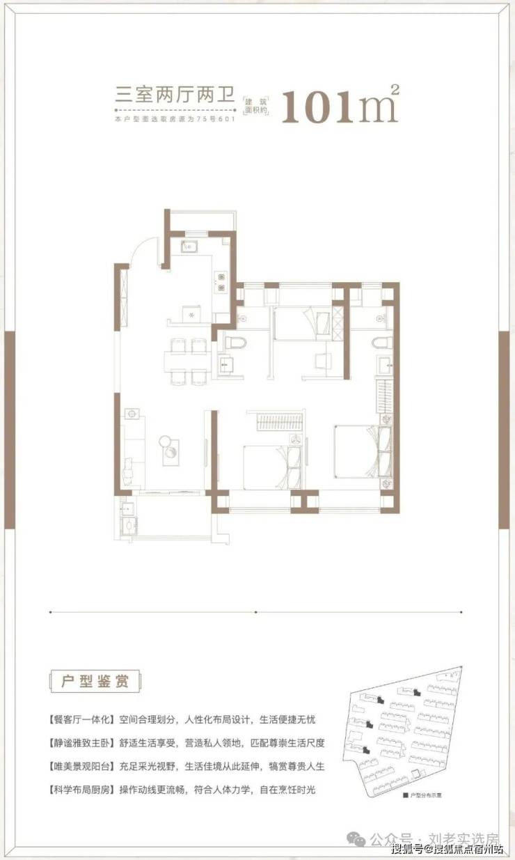 建面约101㎡3房2厅1卫,约101㎡B户型是做到了 三开间朝南+主卧套房设计+动静分离+全卧室带飘窗 ,采光极佳的大3房。