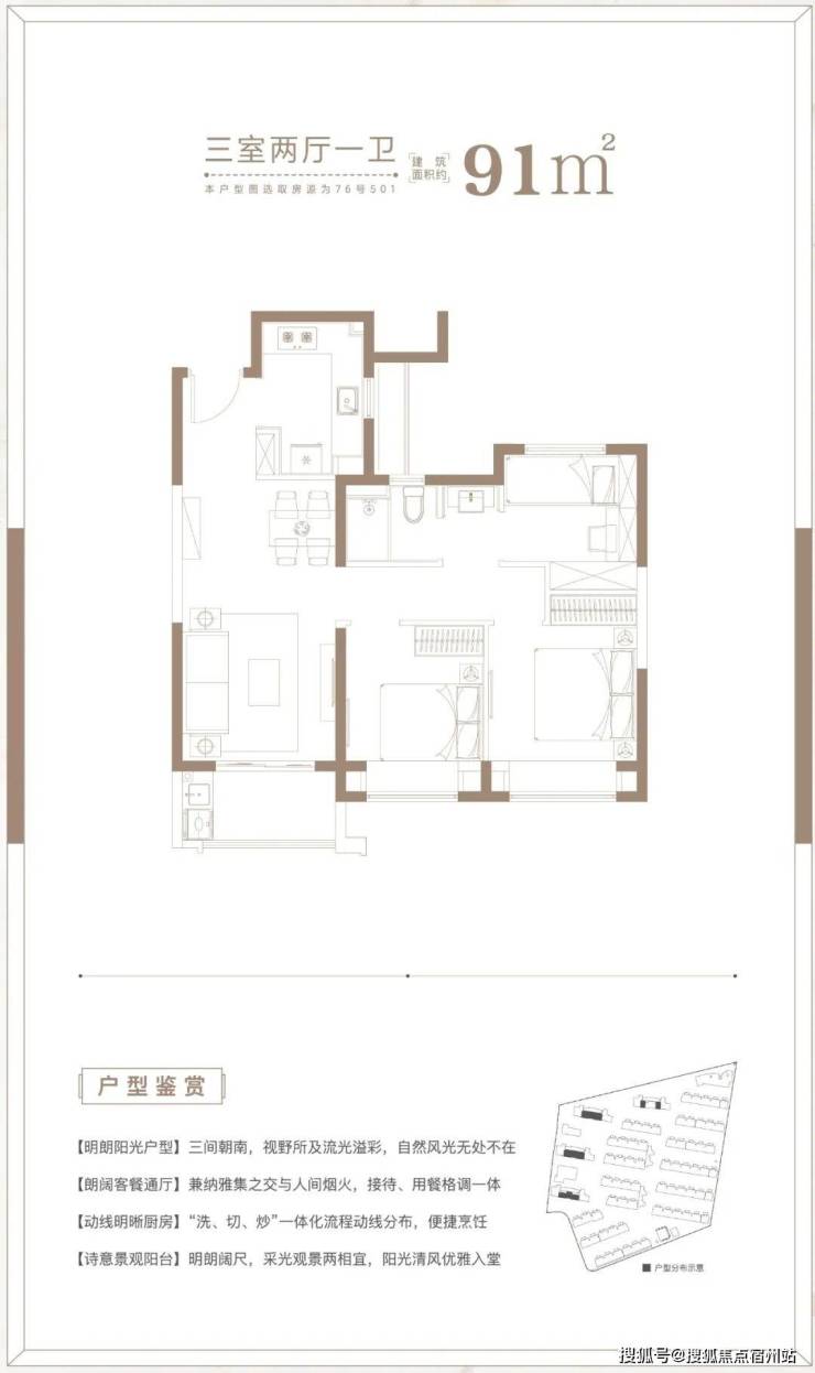建面约91㎡3房2厅1卫户型,做到了 三开间朝南+双朝南卧室带飘窗+动静分离+卫生间干湿分离 ,采光面拉到极致的小3房户型。