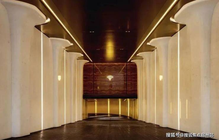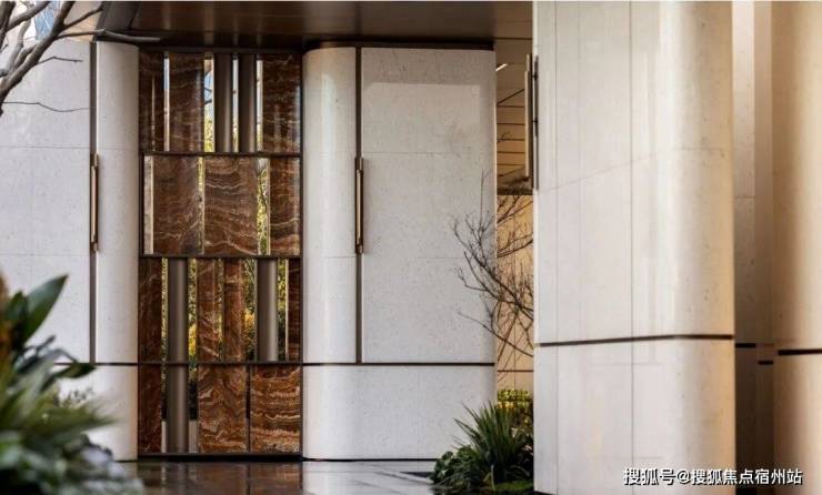 6、 社区含“奢材”量很高。 门庭延街的外立面,以精工定制弧形 米色石材 为主调,镶嵌典藏级 老虎玉大理石 ,点缀 古铜色现代海派艺术感 灯器,整体呈现出百年海派的贵雅气质。