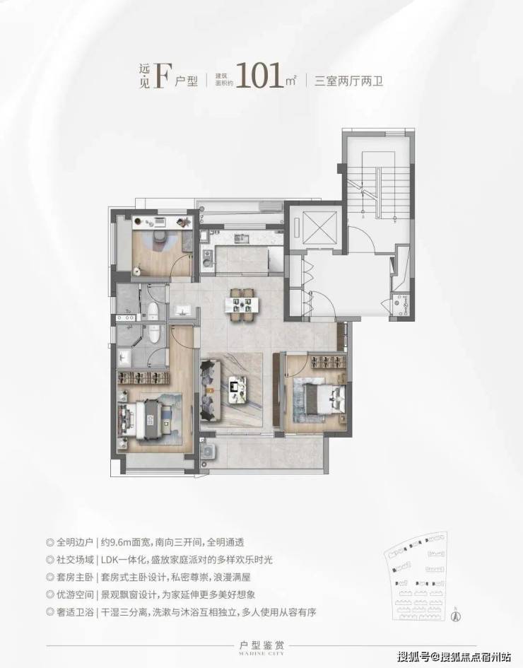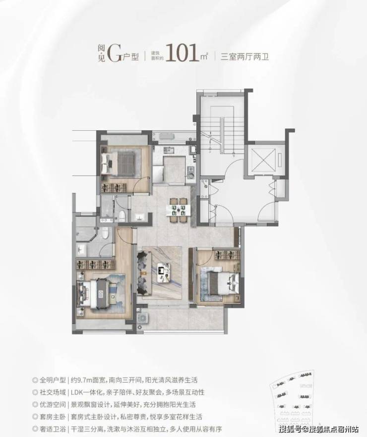 建面约101㎡的F和G户型都是市面上备受认可的飞机经典款户型。