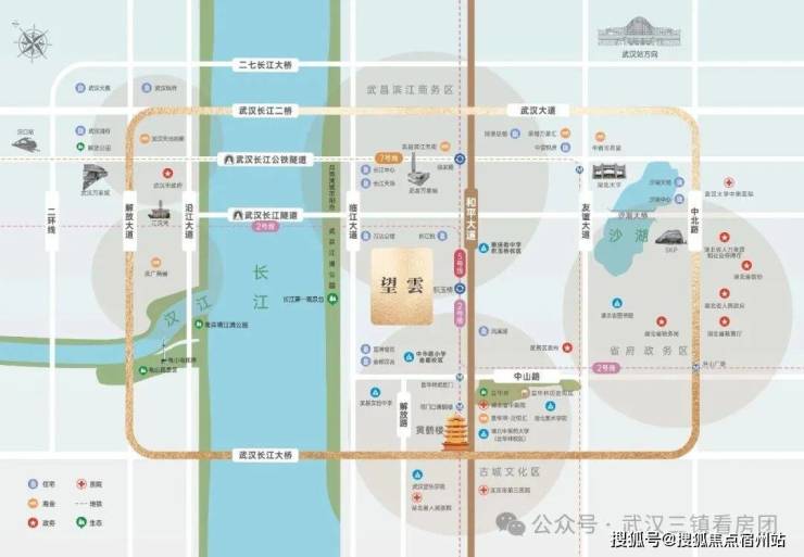二轨二桥二隧:双地铁上盖,无缝衔接积玉桥站2号线、5号线;依托长江大桥、长江二桥以及长江隧道和武汉公铁隧道,快速纵横全城。