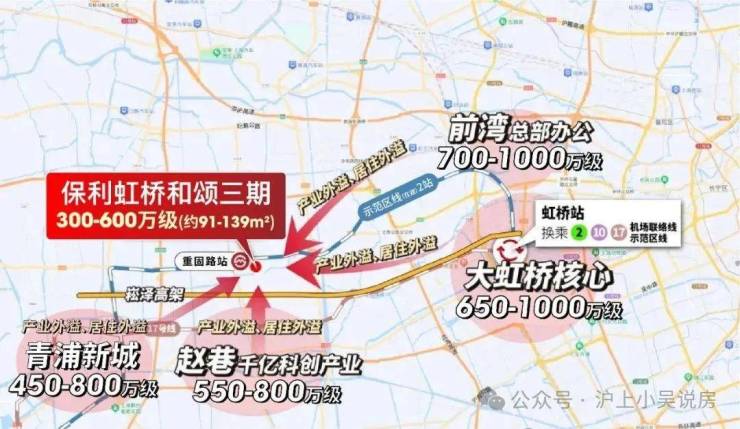 由此可见, 示范区线沿线连接着华为、前湾、大虹桥、临空、中山公园、市中心、张江、华泾等一众超强产业区。保利虹桥和颂三期凭借地铁房的优势及价格红利,必将成为这些产业区人才置业的热门之选。