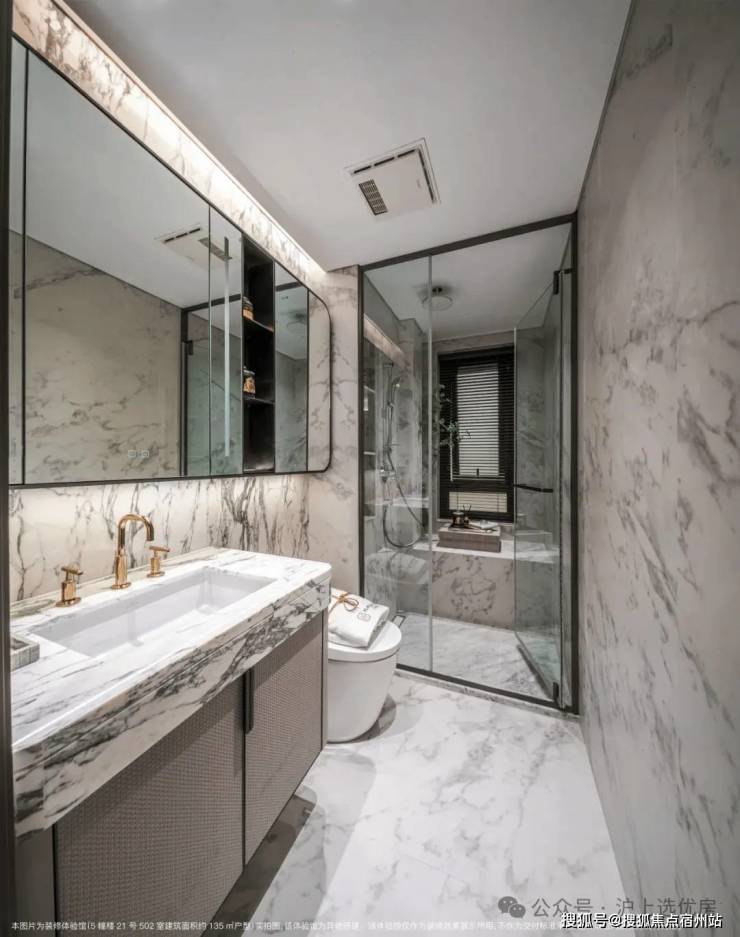 卫生间墙面采用大面积岩板,台盆柜处 定制镀金龙头;另外超大镜面柜内配置了充电口,方便剃须刀、电动牙刷等工具收纳。