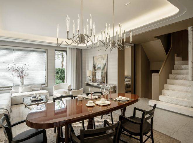 时代之城叠墅立面则采用经典三段式设计,以传统经典演绎现代时尚,超扁平极简立面镜像,配合局部天青色釉面陶板,,同样大面玻璃开窗(LOW-E玻璃),可更大程度的为业主带来宽绰视野,体验摩登生活。