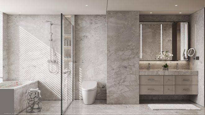 时代之城高层采用现代极简的建筑风格, 高层/小高层立面采用极简线条垂直一体化设计,搭配银白色高科技铝型材和珍珠白水磨石立面,配上顶部具有昭示感的塔冠+大面玻璃开窗(LOW-E玻璃),打造出光影交织的城市天际线。