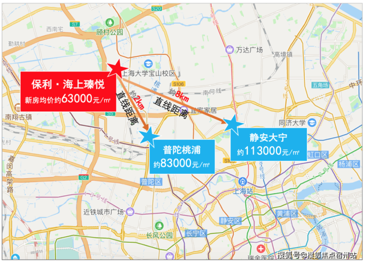 从环线上来看,保利·海上瑧悦距离普陀桃浦和静安大宁非常近。尤其是桃浦,直线距离仅约2公里,但是房价约相差超过2万/㎡!可见,约2.5km的距离,却有着约2万/㎡的价格差。