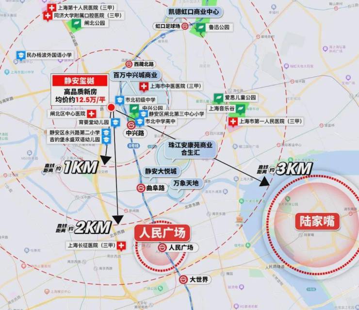 【商业】直线距离2KM范围内拥有静安大悦城、万象天地、百万中兴城等商业配套;3KM直达4大黄金商圈——人民广场、南京西路、陆家嘴、静安寺商圈。☑️☑️静安玺樾售楼处电话:400-1183-605☑️☑️