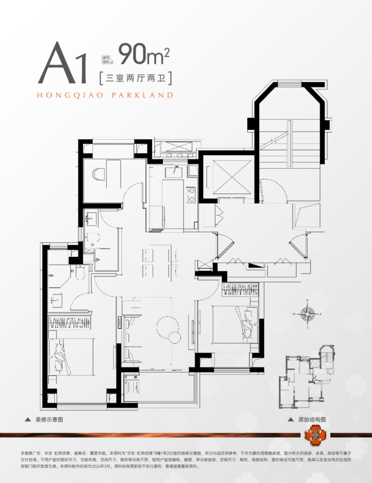 以建面约90㎡户型为例,该户型做到了三房两厅两卫,总价段在一定范围内极具吸引力。三开间朝南的设计,使得南向面宽约9.6米,主卧、次卧与客厅均能沐浴在温暖的阳光之中,室内采光与通风效果极佳。动静分区明确,U 型厨房操作便捷,双卫设计更是贴心地解决了多人口家庭早上 “抢厕所” 的烦恼。主卧采用套房式设计,带独立卫浴与飘窗,增加了居住的私密性与舒适度。