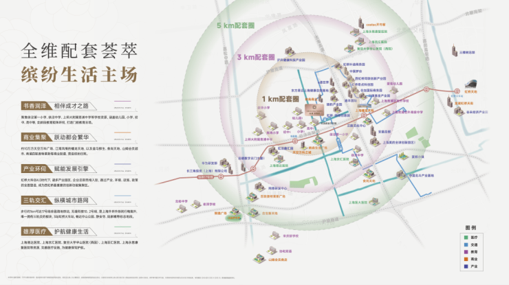 项目直线 3km范围内分布着7个商场,合生新天地等购物中心近在咫尺。向东约600米处,预计今年开业的长三角绿色智谷 Terrace Park 购物中心,作为大虹桥首个日式购物中心,计划引入 180余家商户品牌,届时将为居民带来全新的购物与休闲体验。此外,通过17号线向东,2站可达天空广场,3站直达蟠龙天地,周边还有百联奥特莱斯、元祖梦世界、山姆会员店等大型商业综合体,满足日常生活的一切所需,让购物、娱乐、休闲一站式轻松实现。