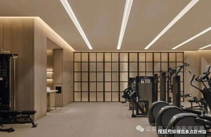 健身房的设计也同样充满了细节。黑框玻璃门的复古韵味,和现代健身空间的功能性做到了完美结合。