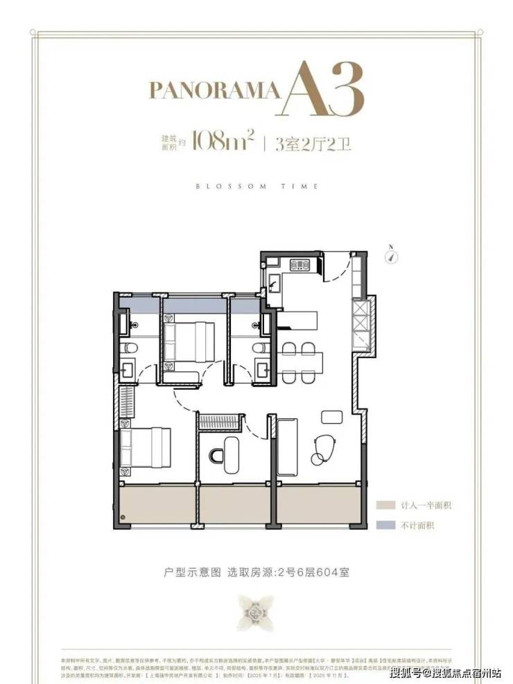建面约108㎡3房,三阳台面积达约13㎡(赠送一半),飘窗赠送约3.3㎡,室内使用面积达约94.5㎡,实得率高达约87%,总赠送面积比常规次卧都大。
