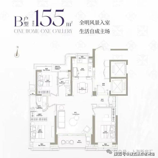 整体布局三开间朝南、南北通透,南向面宽约12米,中央区域为LDKB一体化设计的公共活动区,全明格局带来极佳的室内采光、通风与景观视野体验