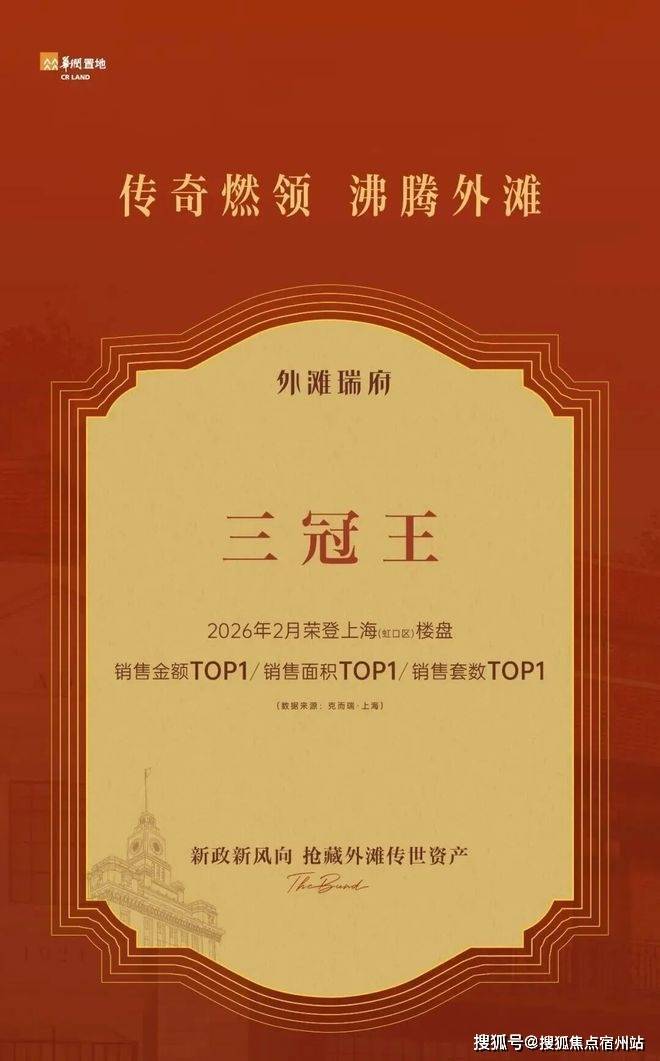 这是项目官方发布的海报,外滩瑞府荣膺2026年2月虹口区新房三冠王。