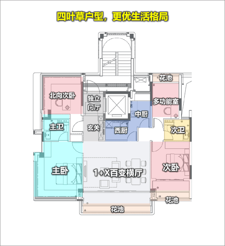 H户型通过转角窗、侧向阳台与多向采光,让户内的主要功能空间都能与外部景观建立联系。